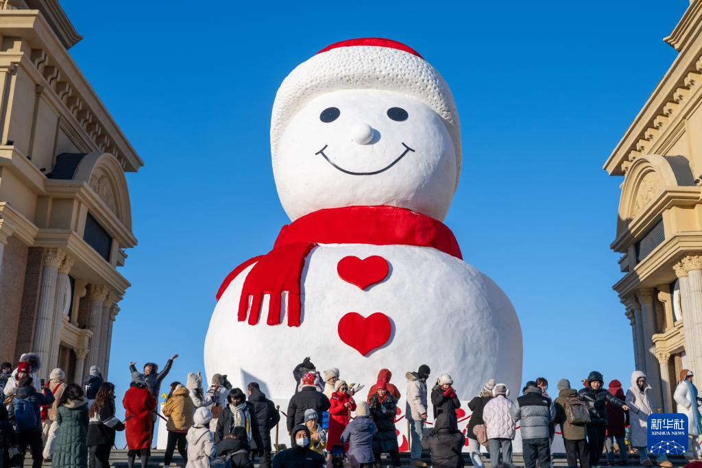 当日,哈尔滨“网红”大雪人“回归”松花江畔。