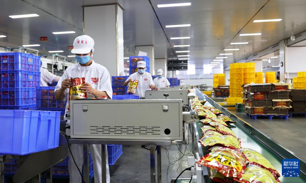 柳州市螺蛳粉产业园一家螺蛳粉生产企业工作人员在包装螺蛳粉(11月13日摄)。