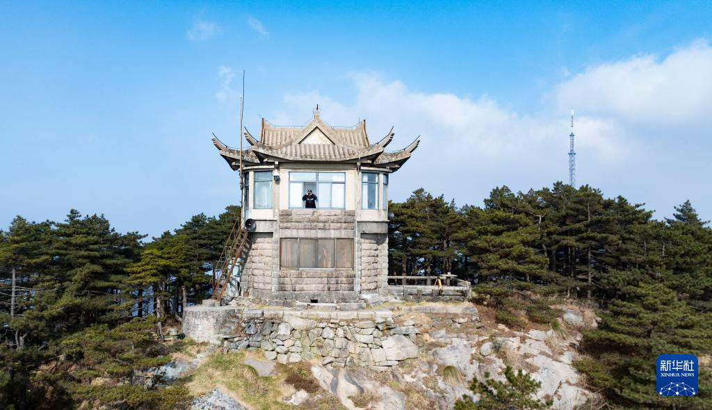 12月18日,黄山风景区管委会园林局瞭望哨防火小队队长秦志平在平天矼瞭望哨用望远镜观察远处情况(无人机照片)。