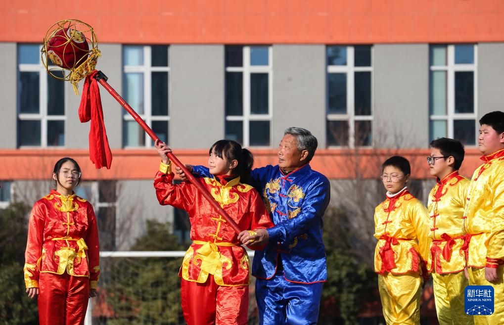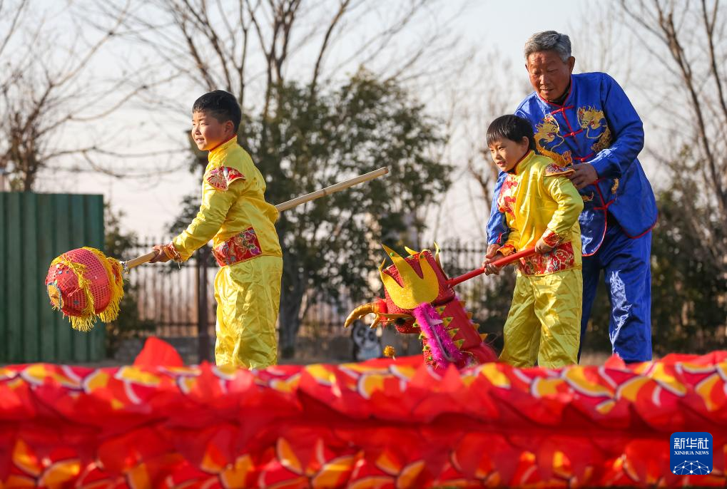 1月10日,非遗传承人在江苏省镇江句容市葛村中心小学教授学生练习舞龙技艺,带领孩子们感受传统文化魅力,迎接新春佳节。