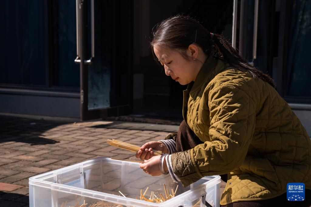 1月25日,杨洁在工作室分拣采集来的原色大麦秆。