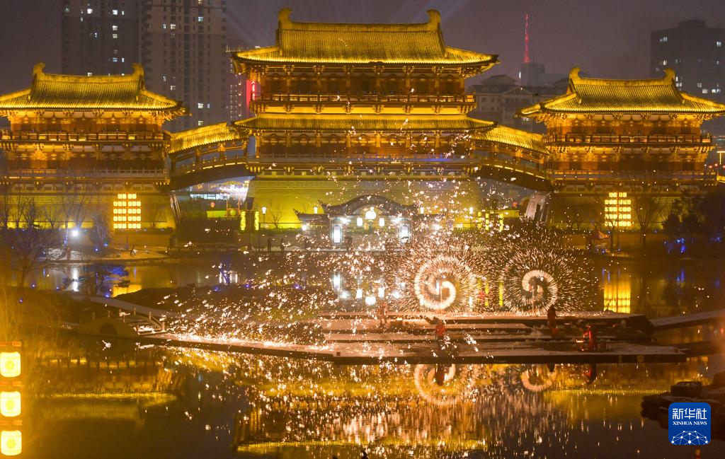 1月25日,表演者在河南省洛阳市隋唐洛阳城九洲池景区展示打铁花。
