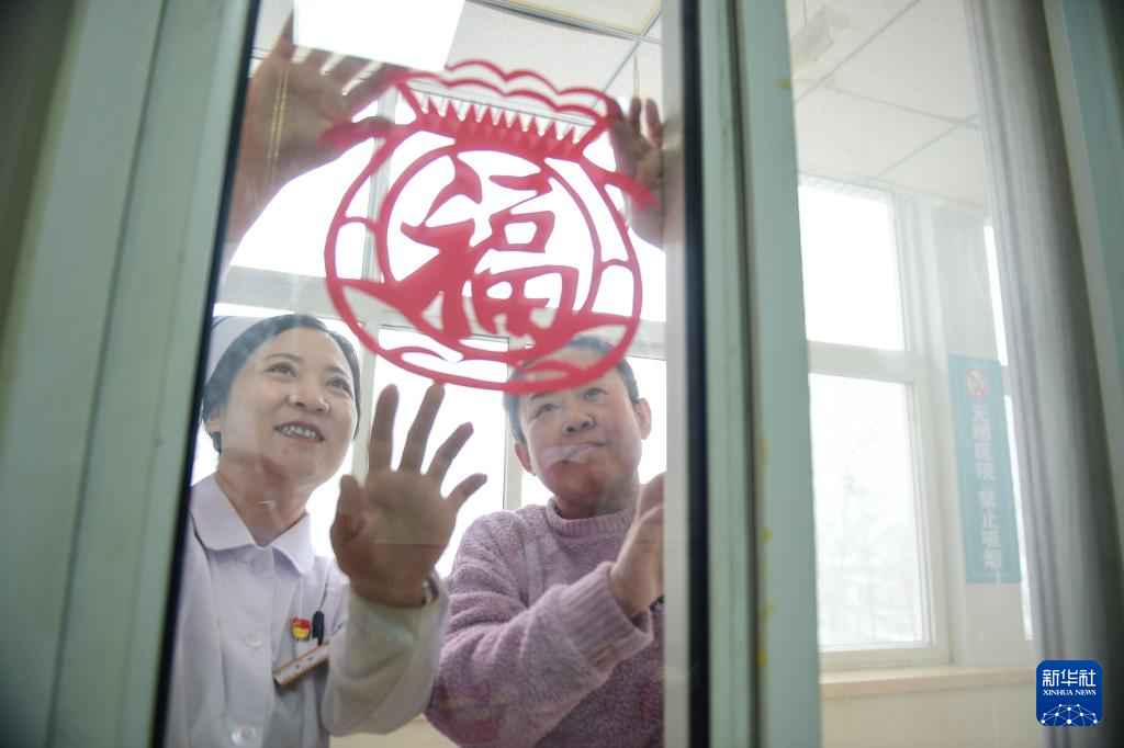 1月26日,河北省沧州市第三医院的医务人员与患者一起贴福字。