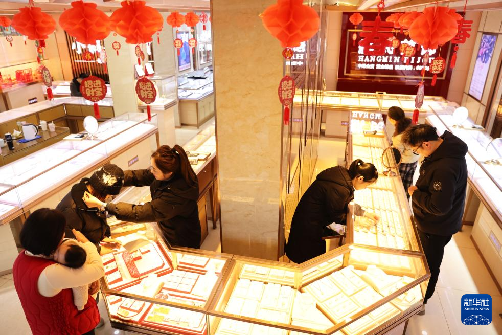 1月26日,人们在浙江湖州德清县乾元镇一家金店挑选首饰。