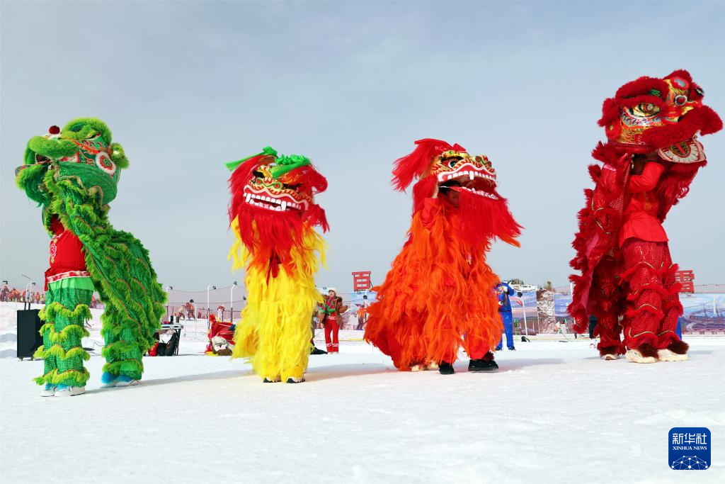 1月26日,民间艺人在湖北省宜昌市夷陵区百里荒滑雪场为游客表演舞狮。