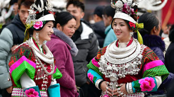 在贵州省凯里市舟溪镇舟溪村茶林苗寨,两对苗族双胞胎姐妹穿戴盛装完毕后在一起交流(2月15日摄)。