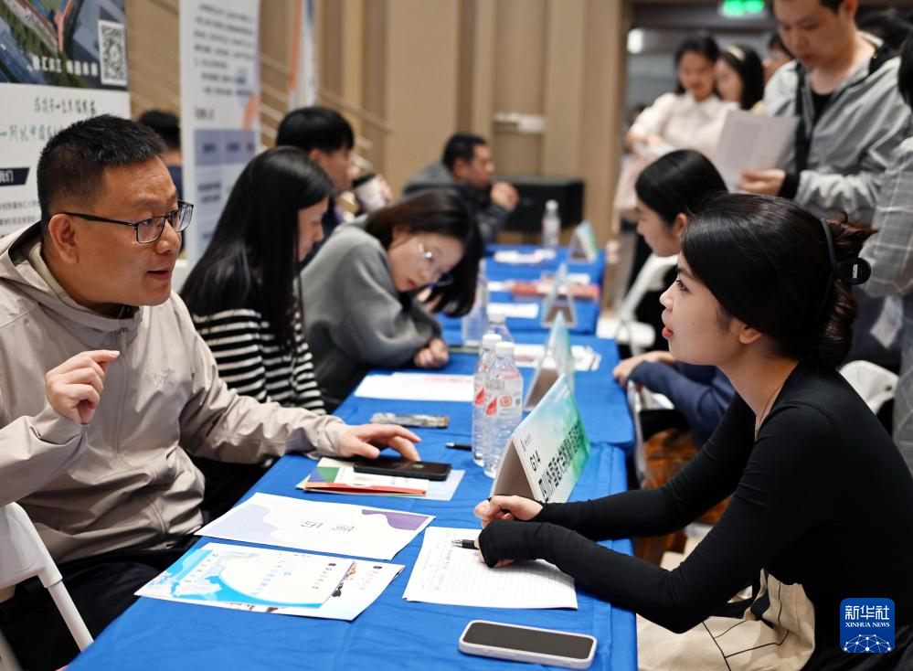 4月8日,用人单位代表在招聘会现场与求职者交流。