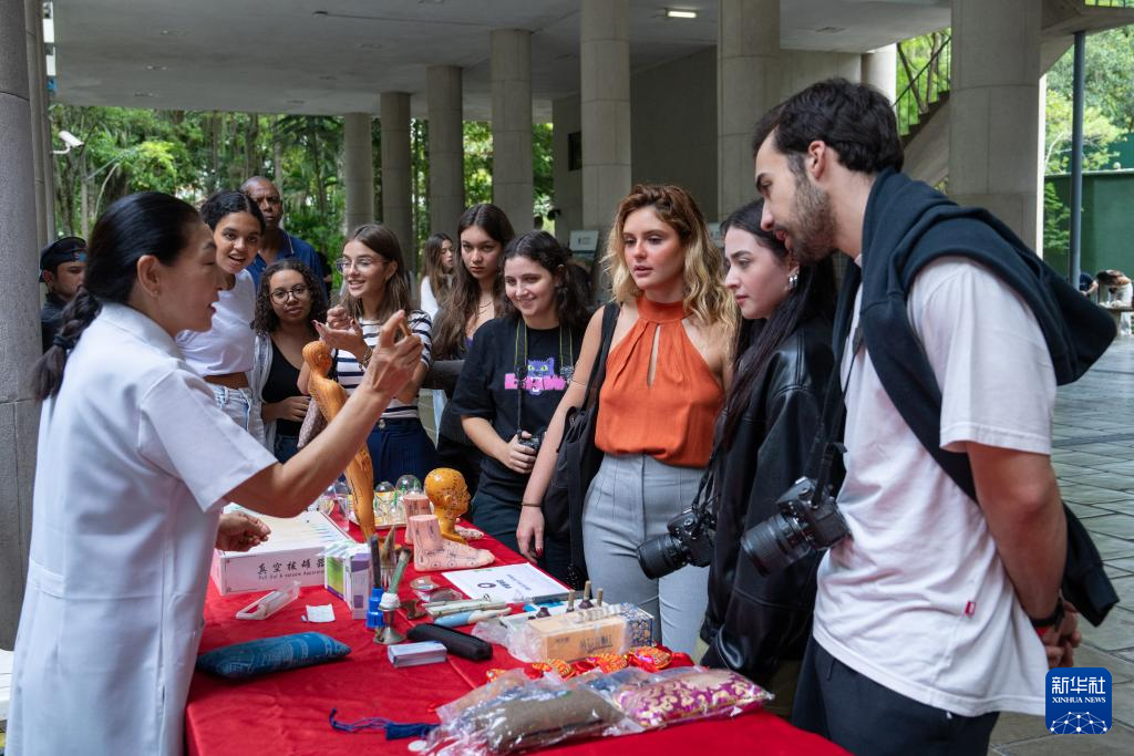 4月15日,在巴西里约热内卢天主教大学举办的“国际中文日”庆祝活动上,学生们观看中医疗法展示。