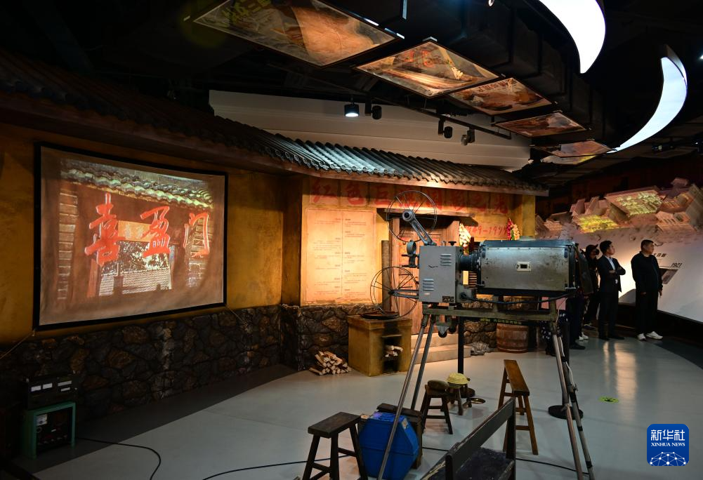 4月28日,观众在青岛电影博物馆农村露天放映场景复原展区参观。