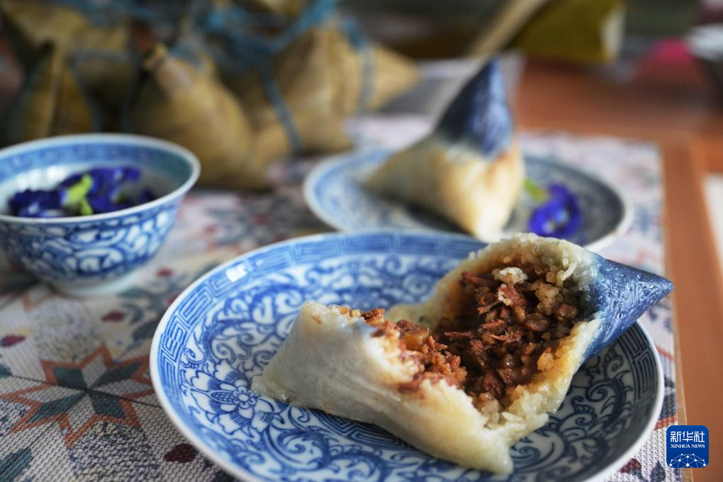 数百年前,早期的中国移民来到马六甲,与当地人通婚,其后代男性被称为峇峇,女性被称为娘惹。中国美食在南洋也焕发出全新光彩,娘惹粽就是其中的代表。蓝色糯米是娘惹粽的一大亮点,要用蝶豆花熬出天然色素来染色。新加坡娘惹博物馆展示的娘惹粽馅料选用炒冬瓜糖丝与香料腌制的剁碎猪肉,并用斑斓叶与竹叶包裹。