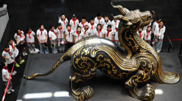 7月7日,一名小朋友在江西南昌滕王阁内的《滕王阁序》铜碑前驻足。