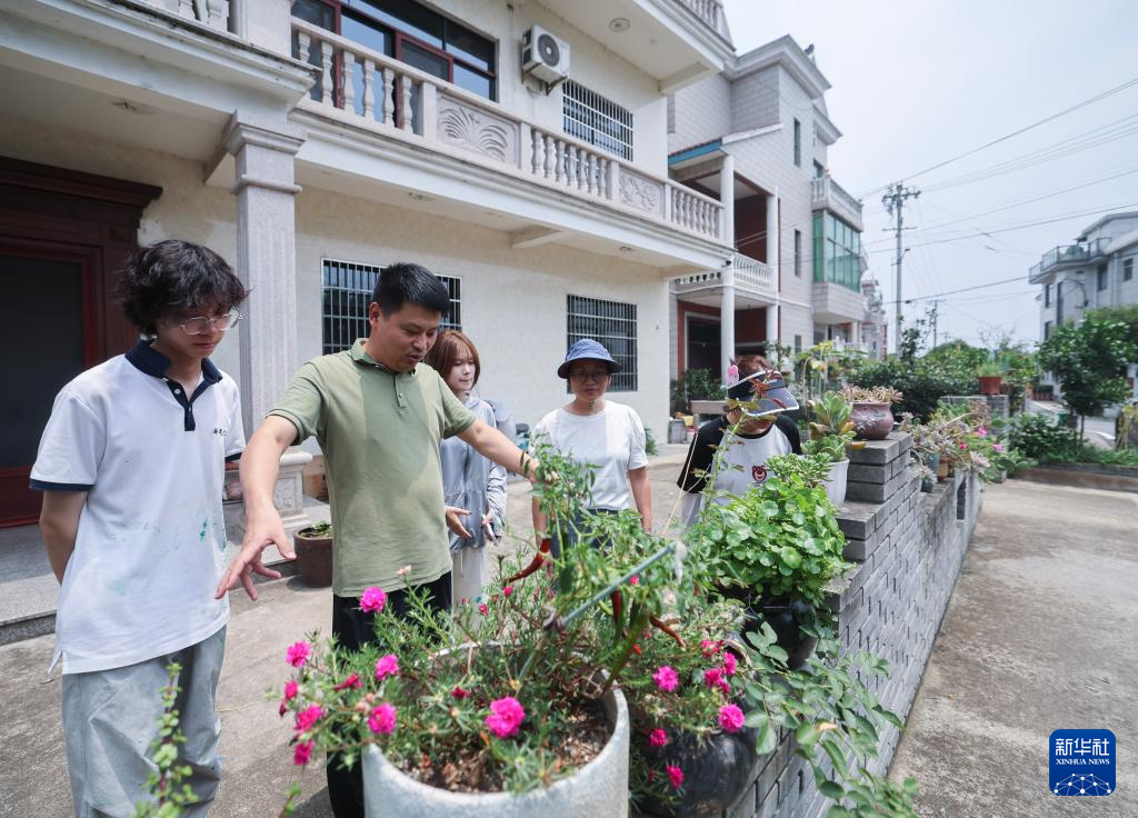 7月15日,在诸暨市安华镇丰江周村,绍兴市文化特派员陈航峰(左二)带着浙江农林大学暨阳学院的学生们走访村舍庭院,并提出美丽庭院的设计意见。