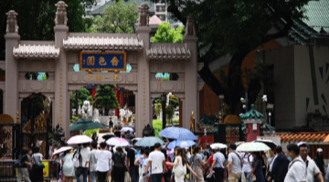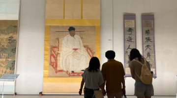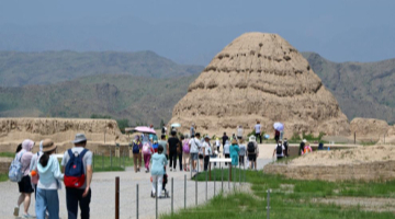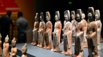 7月14日,游客在大汶口遗址博物馆内参观出土陶器。