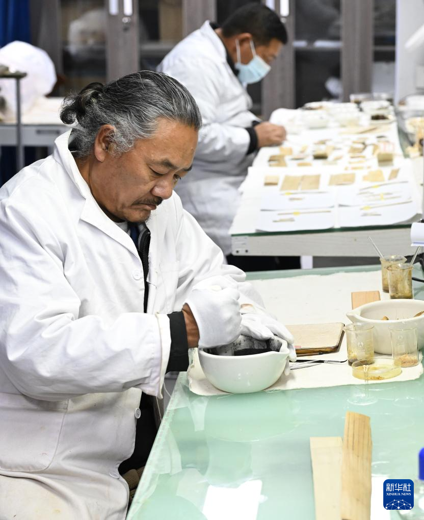 5月25日,布达拉宫贝叶经实验性修复小组实验室工作人员在对用于贝叶修复的颜料进行研磨处理。