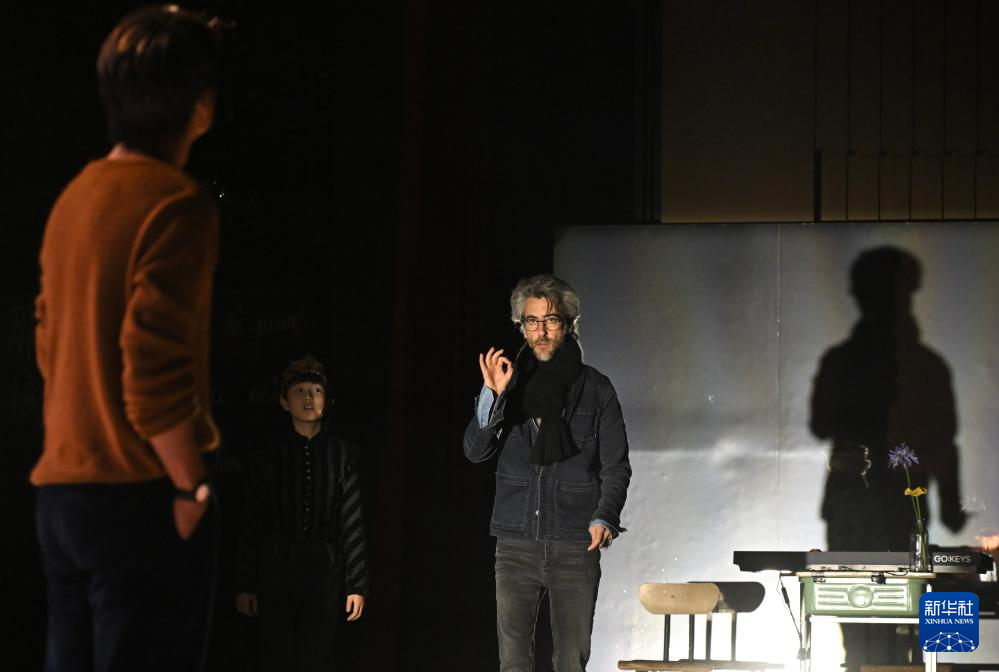 11月14日,导演让·贝洛里尼(右)指导演员排练。