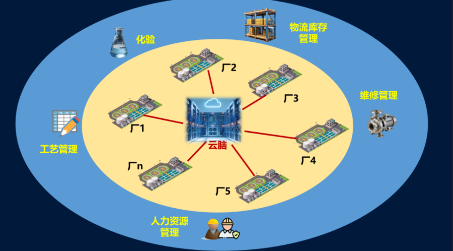 图为“云端大脑”架构:数据、设备、人员等跨厂区协同。