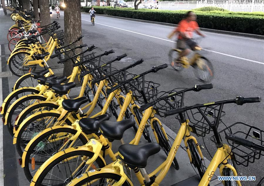 Photo taken by mobile phone shows shared bicycles on a sidewalk in Beijing, capital of China, Aug. 3, 2017. The Chinese government issued guidelines on Thursday to regulate bike-sharing services, which have boomed nationwide but led to urban management challenges. (Xinhua/Luo Xiaoguang)