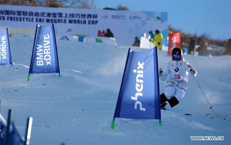 Frida Lundblad of Sweden competes during the ladies' Moguls on the Day 2 of the 2017-2018 Freestyle Skiing World Cup-Moguls & Aerials at the Thaiwoo ski resort in Chongli District of Zhangjiakou City, north China's Hebei Province, Dec. 22, 2017. (Xinhua/Meng Jing)