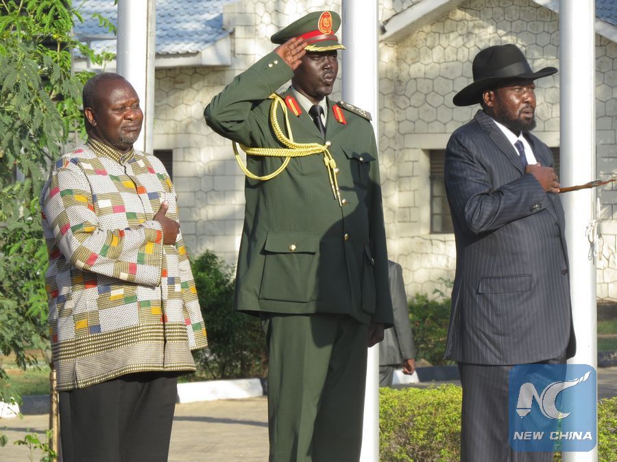 File photo shows South Sudanese President Salva Kiir (R) and former South Sudanese first Vice-President Riek Machar (L) in Juba, capital of South Sudan, on April 26, 2016. Riek Machar was then sworn in as the country's first vice president. (Xinhua/Denis Elamu)