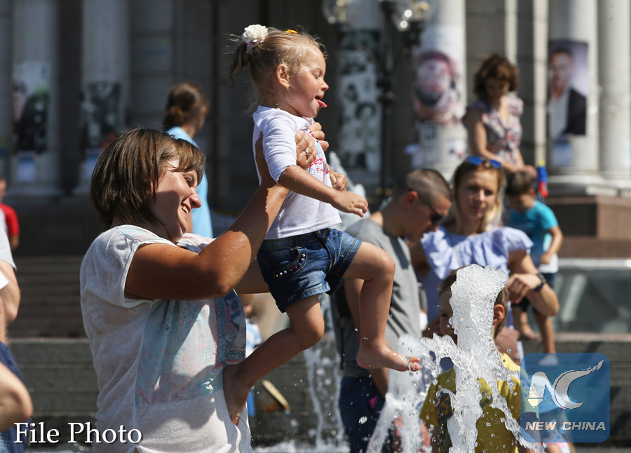 People cool themselves off at a fountain in Kiev, Ukraine, on Aug. 13, 2017. (Xinhua/Sergey)