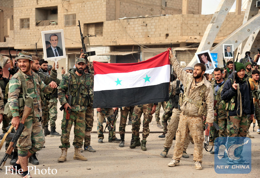 Syrian government soldiers celebrate victory against the Islamic State (IS) in the eastern city of al-Bukamal in Syria, Nov. 20, 2017. (Xinhua/Ammar Safarjalani)