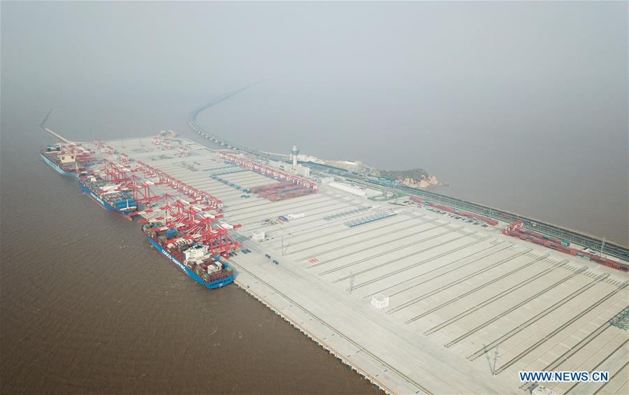 Photo taken on Dec. 10, 2017 shows the Phase IV of Shanghai Yangshan Deep Water Port in Shanghai, east China. Located at the south of Donghai Bridge, phase IV of the Yangshan Port, the world's biggest automated container terminal, started trial operations on Dec. 10, 2017. It covers 2.23 million square meters and has a 2,350-meter shoreline. Once it enters full operation, the fourth phase of the Yangshan Port will initially be able to handle 4 million TEUs (twenty-foot equivalent units). The number will expand to 6.3 million TEUs at a later stage. (Xinhua/Ding Ting)