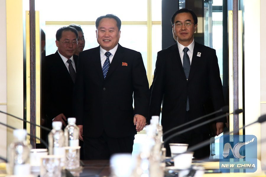 Ri Son-gwon (L, front), chairman of the Committee for the Peaceful Reunification of the Fatherland of the Democratic People's Republic of Korea (DPRK), and South Korean Unification Minister Cho Myoung-gyon (R) arrive at a meeting room in the truce village of Panmunjom, Jan. 9, 2018. (Xinhua/South Korean Unification Ministry)