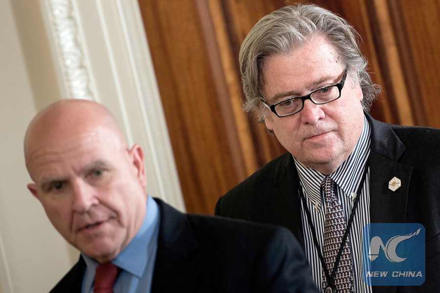 This April 12, 2017 file photo shows National security advisor H.R. McMaster (L) and then White House strategist Steve Bannon arriving for a joint press conference with US President Donald Trump and NATO Secretary General Jens Stoltenberg in the East Room at the White House in Washington, DC. (Xinhua/AFP photo)