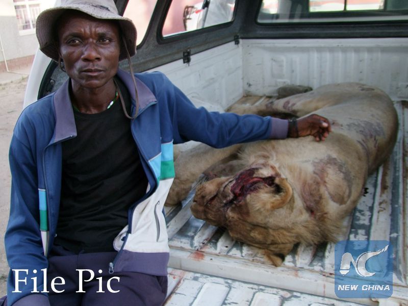 A man sits next to a dead lion at a village in Opuwo, north-western Namibia, Feb. 13, 2016. The man gunned down the lion after it killed a bull, a dog and left a cow wounded in Opuwo. (Xinhua/Nampa)