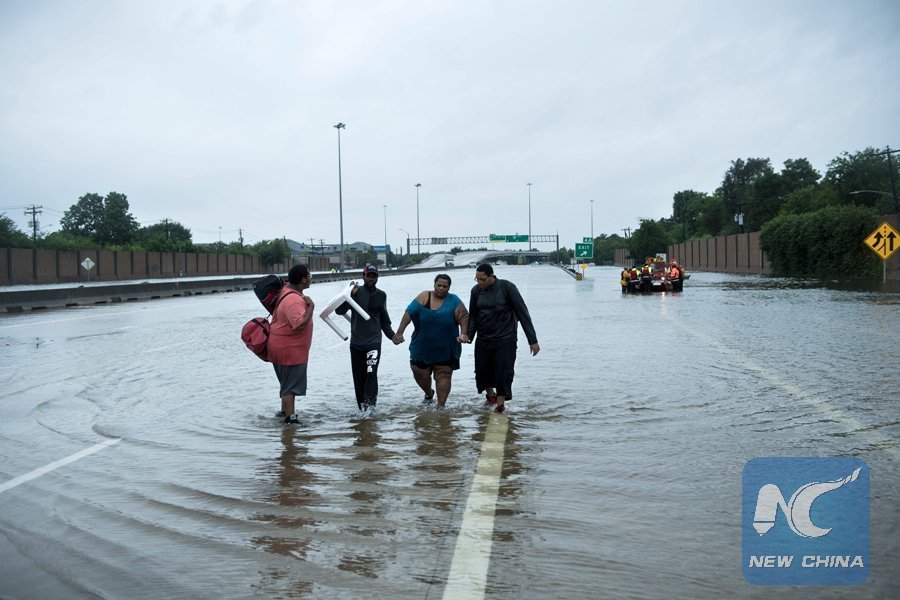 People make their way onto an I-610 overpass after being rescued from flooded homes during the aftermath of Hurricane Harvey August 27, 2017 in Houston, Texas. (Xinhua/AFP)