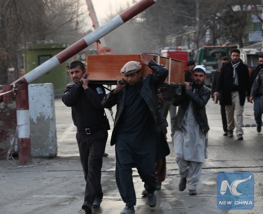 People carry a body of a victim from the blast site inKabul, Afghanistan, Jan. 27, 2018. Death toll from an explosive-laden ambulance detonated by a terrorist in Kabul on Saturday rose to 95, with 158 others wounded, according to a Public Health Ministry spokesman. (Xinhua/Rahmat Alizadah)