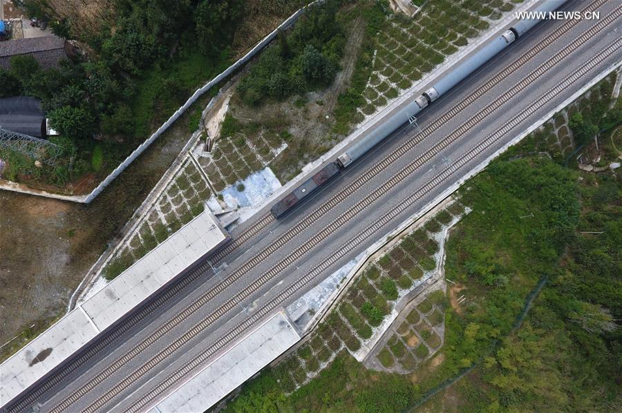 Photo taken on Sept. 18, 2017 shows a train running on Lanzhou-Chongqing railway, in the Guangyuan section within southwest China's Sichuan Province. Lanzhou-Chongqing railway, a major railway connecting Lanzhou City in northwestern province of Gansu with the southwestern metropolis Chongqing, will fully open to traffic on Sept. 29, 2017, according to a press conference held by Lanzhou Railway Bureau Thursday. The railway, which started construction in 2008, also runs through northwest China's Shaanxi Province and southwest China's Sichuan Province. It will play a crucial role in improving transportation efficiency and advance the development program for western China. (Xinhua/Liu Kun)