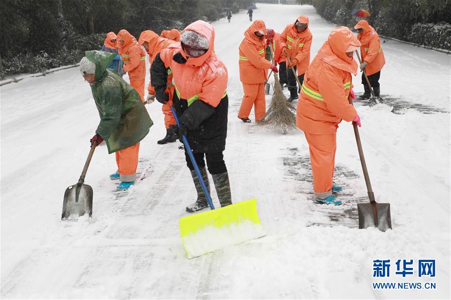 Sanitation workers clear snow from the pavement in Xuyi County, Huai’an City, east China’s Jiangsu Province, Jan. 25, 2018. (Xinhua/Zhou Haijun)
