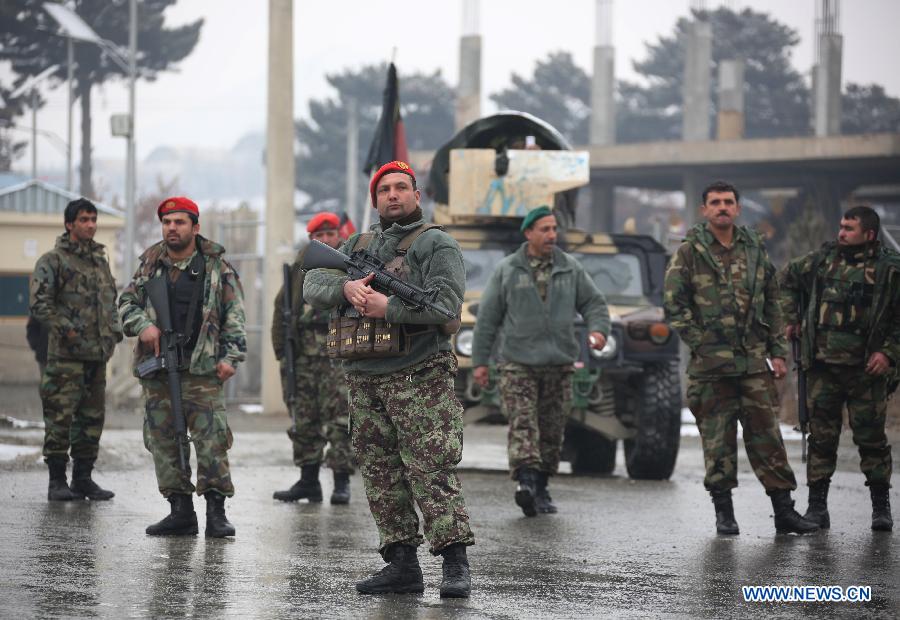 Afghan army soldiersstand outside Marshal Fahim National Defense University afterattack in Kabul, Afghanistan, Jan. 29, 2018. Militants' attack on aAfghan military base in the western edge of Kabul city was over,leaving five people including two security personnel and threeattackers dead and 10 more security personnel injured on Monday,said a statement from the Afghan Defense Ministry. (Xinhua/RahmatAlizadah)