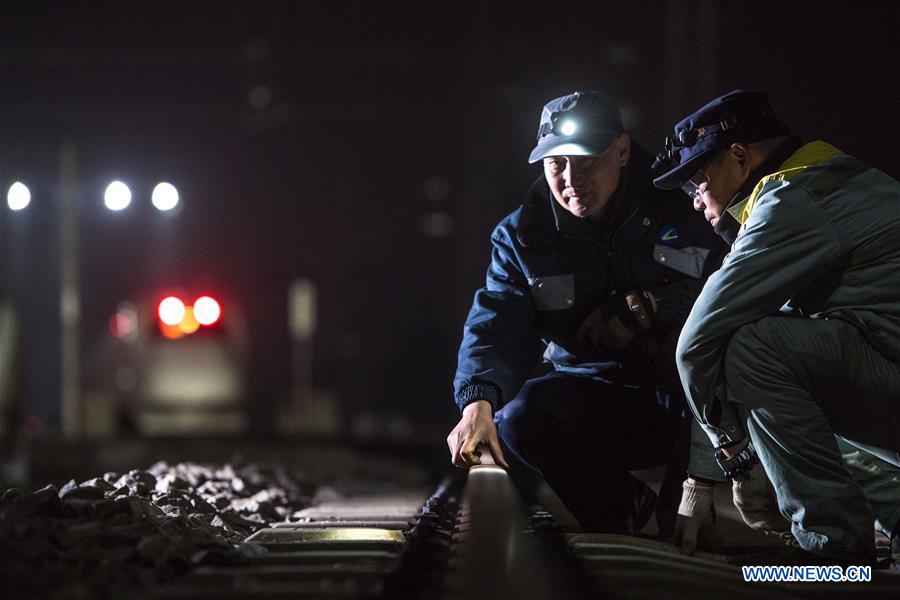 Worker Kang Chaohua (L) checks the rail with his colleague in Wuhan, central China's Hubei Province, Jan. 31, 2018. Workers check the rail to guarantee transportation safety. The 2018 Spring Festival travel rush, known as the Chunyun, started on Feb. 1 and will last till March 12. About 2.98 billion trips are expected to be made during the Chunyun. (Xinhua/Xiong Qi)