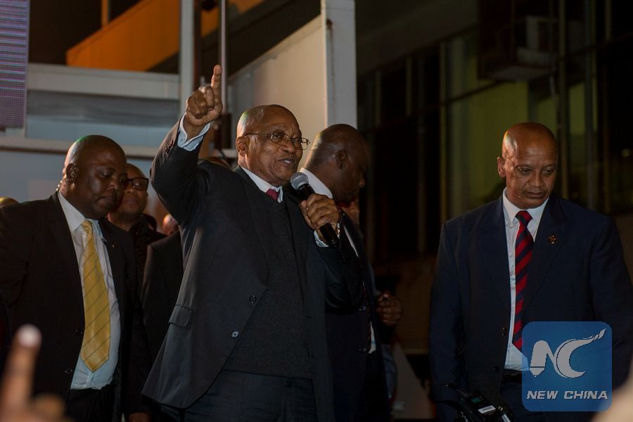 South African President Jacob Zuma (C, Front) addresses supporters of South Africa's ruling African National Congress after he survived a no confidence motion in Cape Town, South Africa, on Aug. 8, 2017. (Xinhua/Jaco Marais)