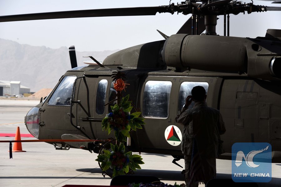 An Afghan security personnel stands beside a Black Hawk helicopter during a handover ceremony from the U.S. forces to the Afghan air force in Kandahar Province, south Afghanistan, Oct. 7, 2017. The U.S. forces has planned to hand over 159 military helicopters to the Afghan air force by 2021, an Afghan government official said. (Xinhua/Sanaullah Seiam)