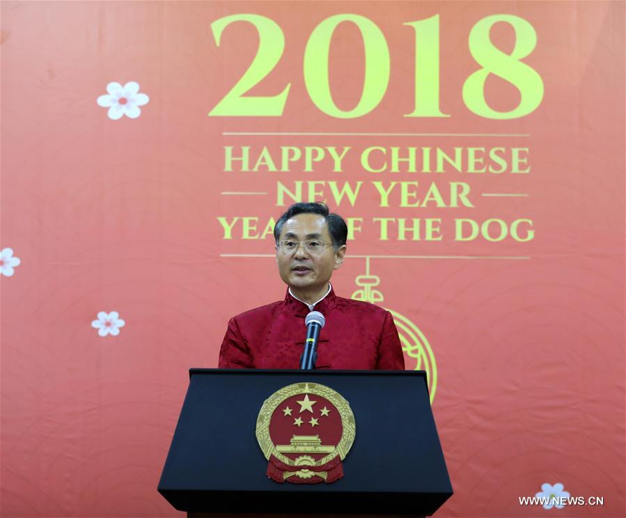 Chinese Ambassador to Rwanda Rao Hongwei delivers a speech at the reception to mark the approaching Chinese Spring Festival in Kigali, captial city of Rwanda, on Feb. 8, 2018. The year 2017 is of "historic significance" to China-Rwanda relations, said Chinese Ambassador to Rwanda Rao Hongwei on Thursday in Rwanda's capital city Kigali. (Xinhua/T. Kisambira)
