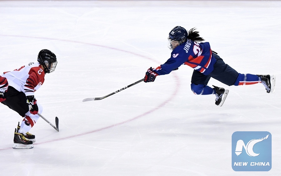 Lee Jingyu (R) of the unified team of the Democratic People's Republic of Korea (DPRK) and South Korea shoots during the preliminary match of women's ice hockey against Japan at the Pyeongchang 2018 Winter Olympic Games at the Kwandong Hockey Centre in Gangneung, South Korea, on Feb. 14, 2018. (Xinhua/Ju Huanzong)