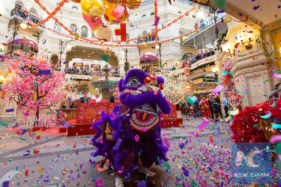 MOSCOW, Feb. 14 (Xinhua) -- Lanterns, red envelopes, the Friendlies, decorations to mark the incoming Year of the Dog ... These can be found as far away from China as Moscow. Despite freezing temperatures, the warm festive atmosphere of the upcoming Chinese Lunar New Year has spread to the snowy Russian capital.