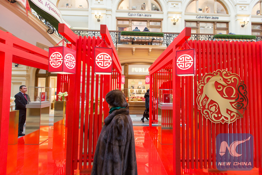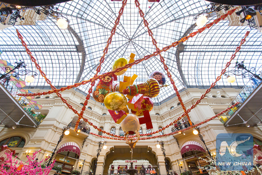 Containing these classic elements in Chinese culture, a series of eye-catching pop art structures are displayed in downtown Moscow's iconic GUM State Department Store next to the Red Square. The shopping center is jointly holding with the China Cultural Center in Moscow a spectacular 20-day theme event featuring the Chinese New Year, also known as the Spring Festival.