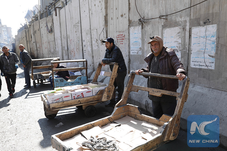 An Iraqi elderly porter waits outside a market in Baghdad to be hired on February 14, 2017. (Xinhua/Khalil Dawood)