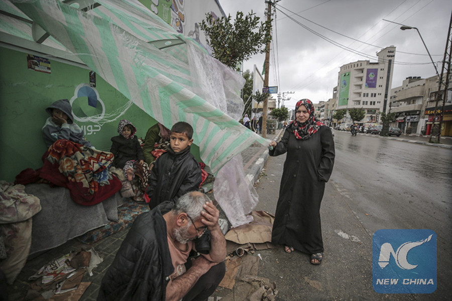 GAZA, Feb. 16 (Xinhua) -- The 10-member family of Fadel al-Diri, a Palestinian homeless man in Gaza Strip, spent most of the cold days of winter in a small tent on a street's side.