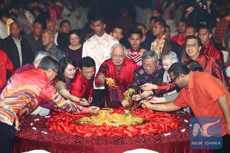 Malaysian Prime Minister Najib Razak (C) takes part in a lunar new year celebration event with the Malaysian Chinese community in Kuala Lumpur, Malaysia, on Feb. 24, 2018. (Xinhua)