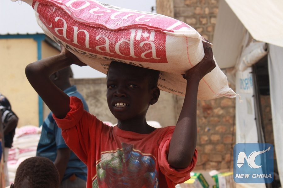 File photo shows an Internally Displaced Person (IDP) carry a sack of maize flour donated by humanitarian organizations at Mahad Camp in central Juba, South Sudan, March 9, 2017. (Xinhua/Gale Julius)