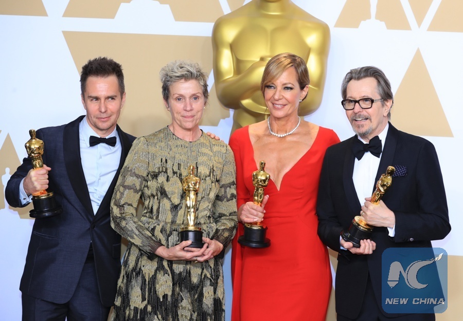 Oscar winners Sam Rockwell, Francis McDormand, Allison Janney and Gary Oldman (L to R) pose at press room of the 90th Academy Awards at the Dolby Theater in Los Angeles, the United States, on March 4, 2018. (Xinhua/Li Ying)