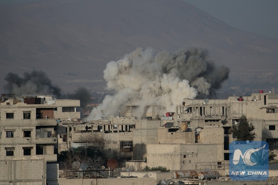 Smoke billows following Syrian government bombardments on the besieged rebel-held town of Hamouria in the eastern Ghouta region on the outskirts of the capital Damascus on March 3, 2018. (Xinhua/AFP)
