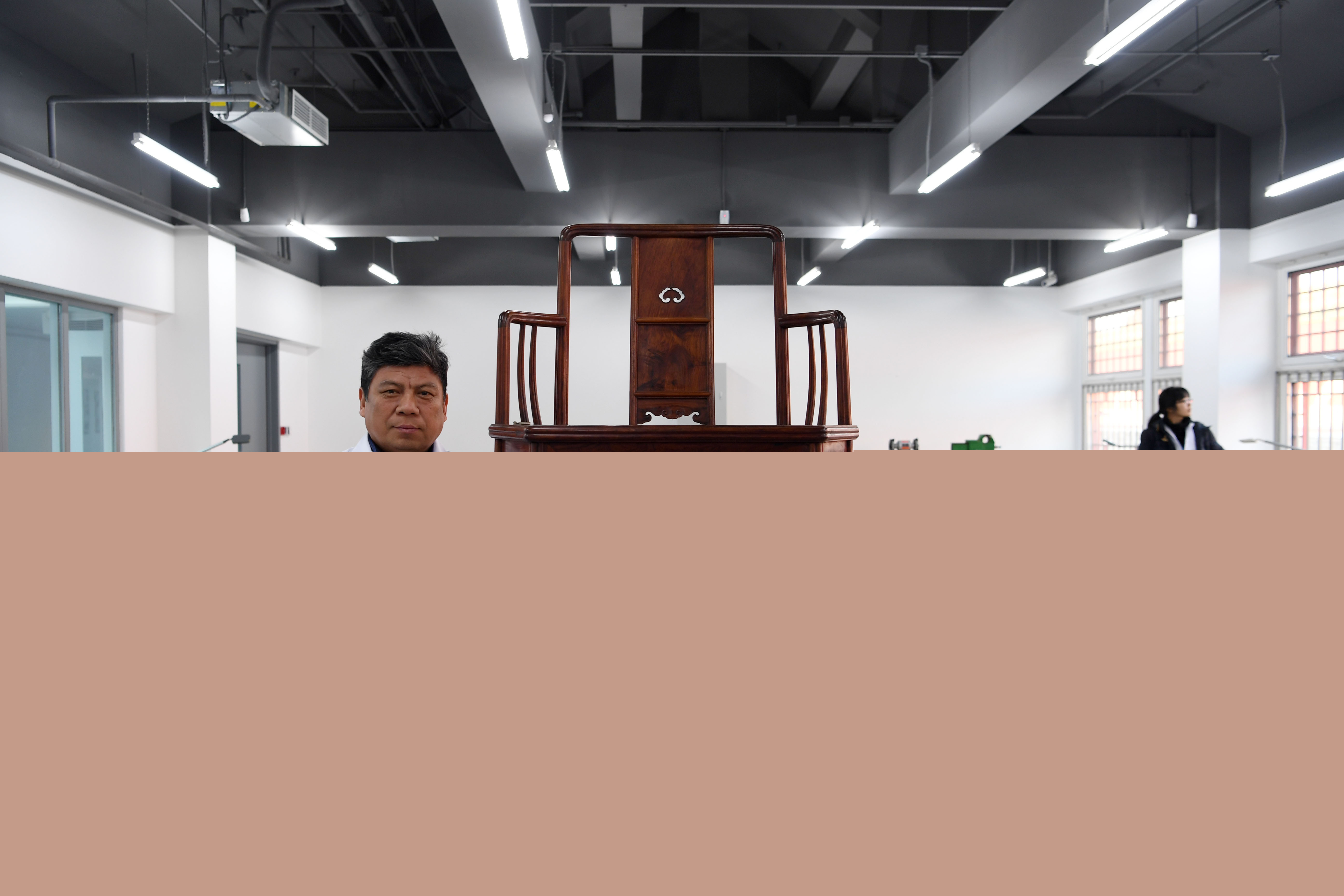 A relic-doctor in the Palace Museum takes photo with a wooden chair of the Ming dynasty (1368-1644)