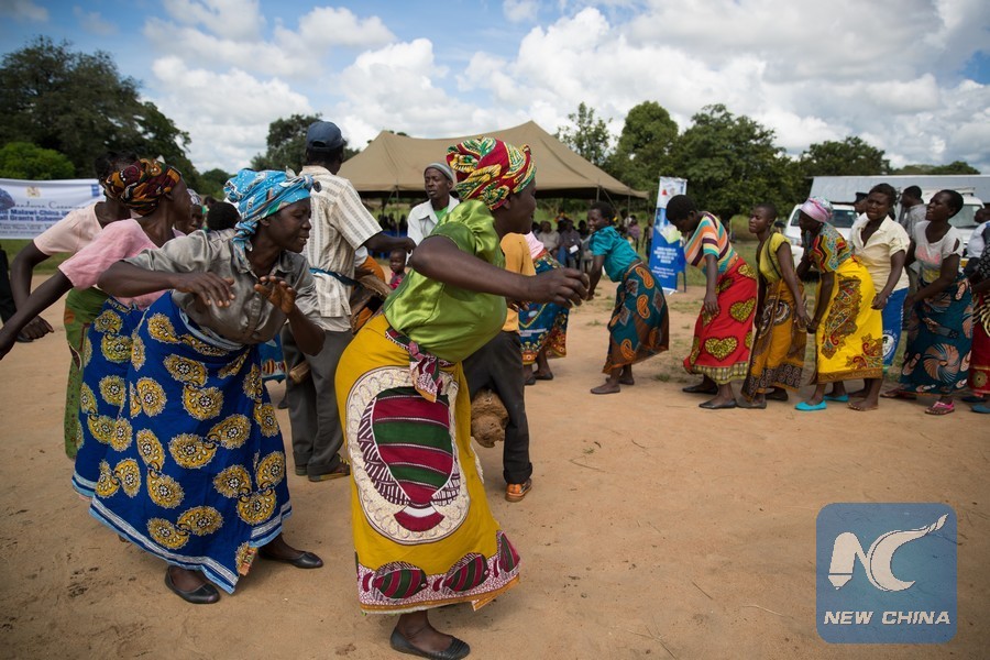 People dance during a handover ceremony of disaster risk reduction projects in Kombeza area, a disaster-prone area in central Malawi's Salima district, March 16, 2018. China on Friday handed over projects to disaster-prone regions of Malawi to help them build resilience and reduce effects of the disasters. (Xinhua/Peng Lijun)