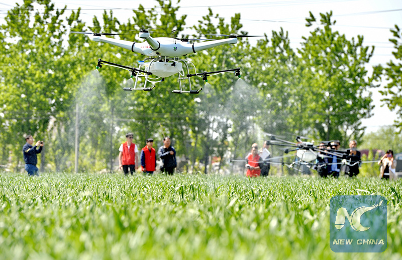 A drone team sprays pesticide in a wheat field in Nanyangjialou Village of Longyao County in Xingtai City, north China's Hebei Province, April 28, 2017. (Xinhua/Mu Yu)